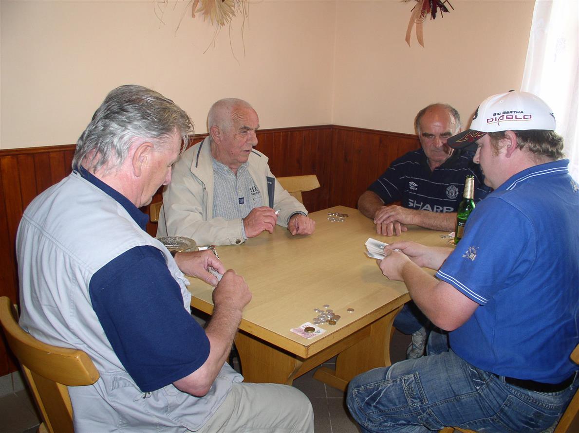 Dvě karetní disciplíny jsou letos na soupisce. Tu první – loňského nováčka prší – sehrají karbaníci v hospůdce sportovního zařízení TJ Sokol, tedy u Davídků. A atmosféra je tu vskutku karbanická. Pach kouře, vůně piva, houstnoucí vzduch, kterým se nesou rady kibiců i karetní hlášky karbaníků. Karty v jejich rukách jen šustí, přičemž na významu a váze hře dodává i hlasité pleskání karet o umakartový stůl. Zkrátka tady se mastí o sto šest. A protože karbanická líheň Hospody U škrpálu je kvalitní a dodává Prčici kvalitní hráče, vyhrává Prčice tuto soutěž poměrem 3 : 2. A je tu další srovnání skóre. Stav je 7 : 7. Jak je to Derby zatím vyrovnané!