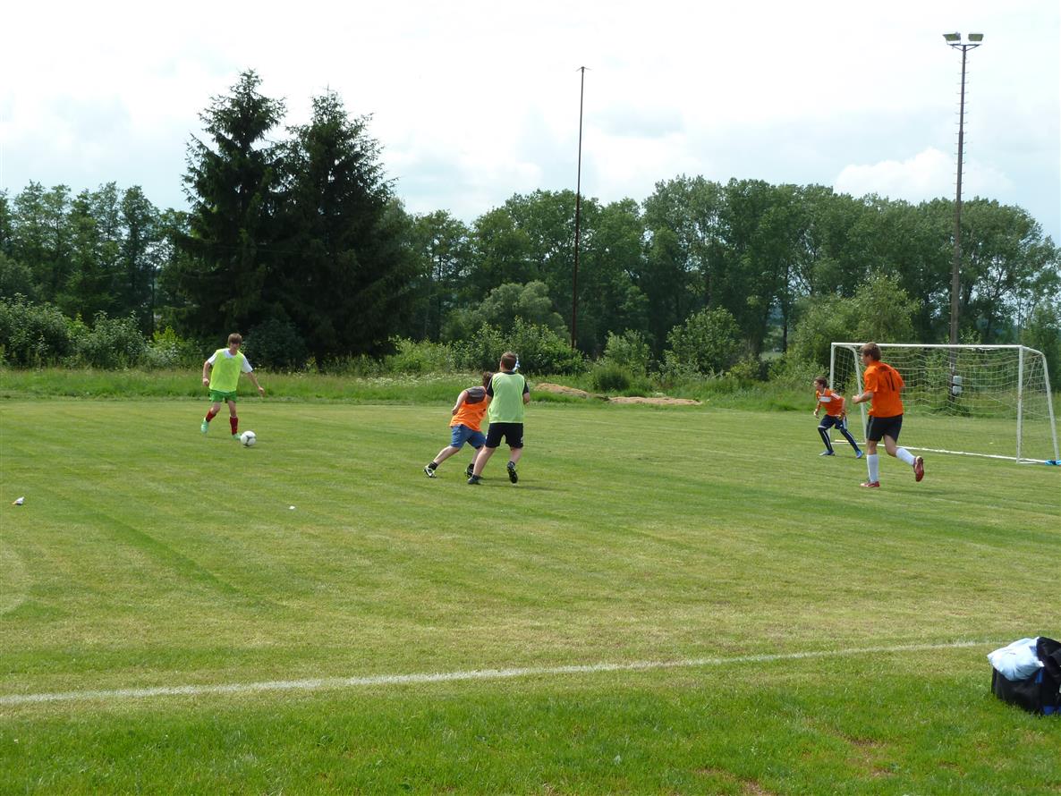 Ve čtrnáct hodin na tréninkovém hřišti startuje také fotbalový blok soutěží. Nejprve si to spolu rozdávají mladší fotbalisté, pak přichází na řadu zápas starších. Oba vyhrává Prčice a nastupuje její trhák. Je to už její 10. bod a zdá se, že je Derby už rozhodnuté.