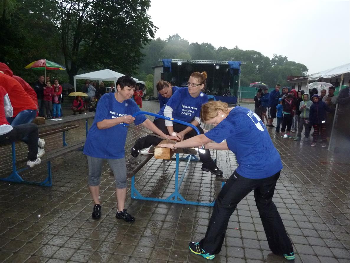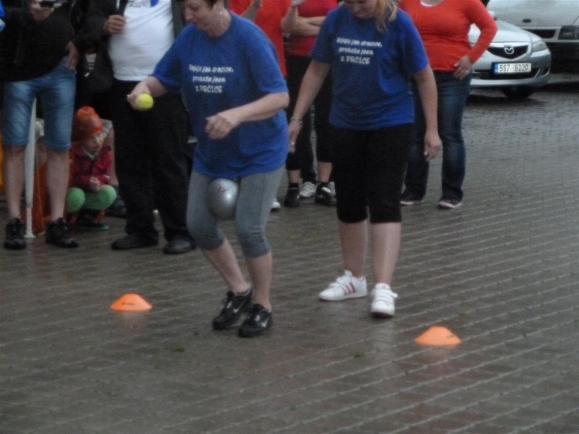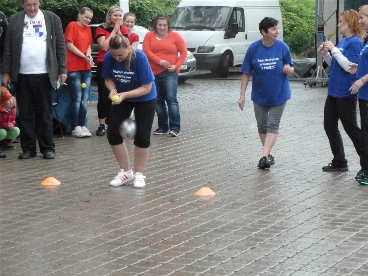 Konečně se přehnala jedna prudká průtrž a začalo se soutěžit. Nastupovaly ženy v tradičním hodu válečkem na panáka. Mušku měly víceméně přesnou obě strany stejně, ale nakonec se přece jen prčickým dařilo o něco více.