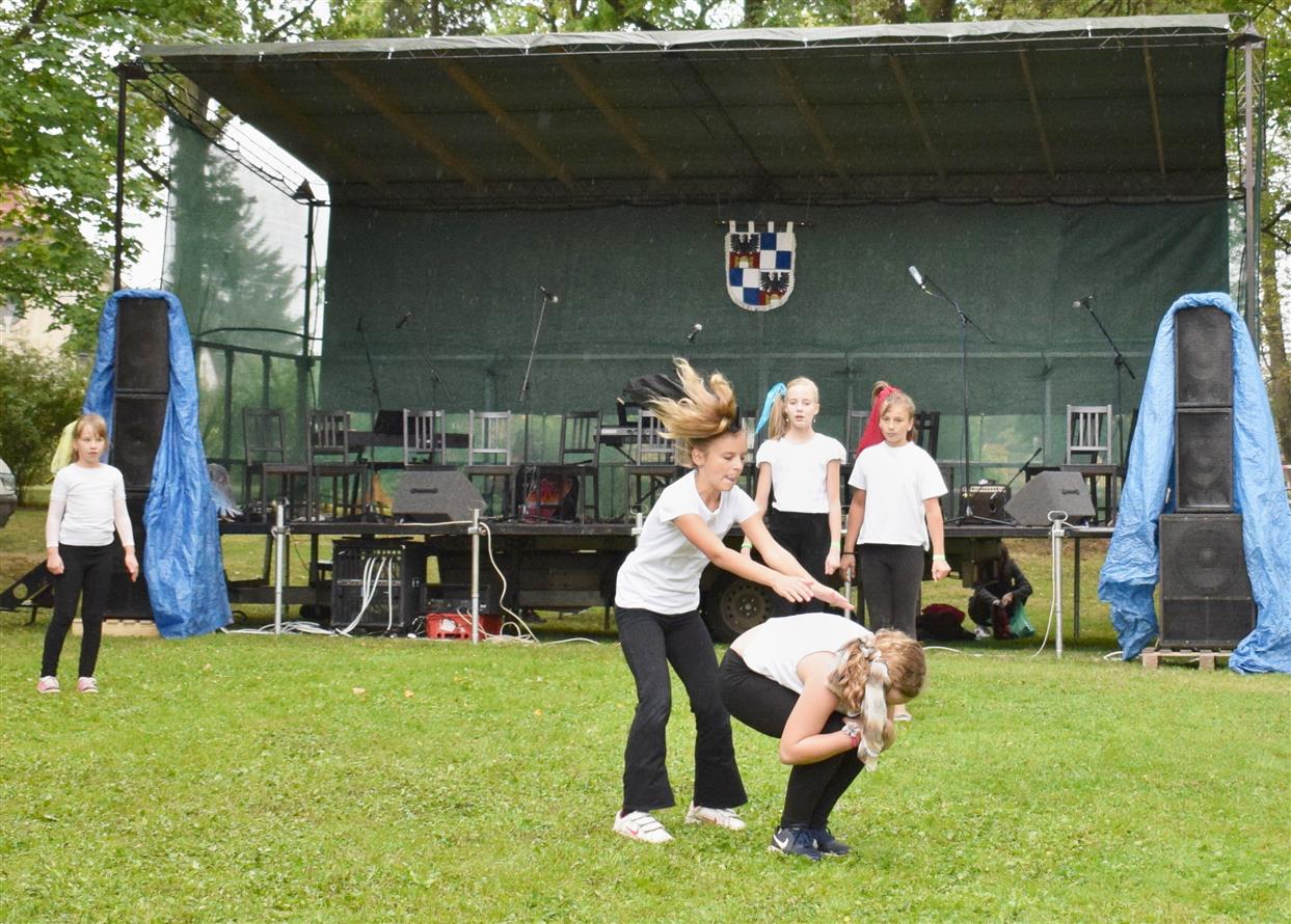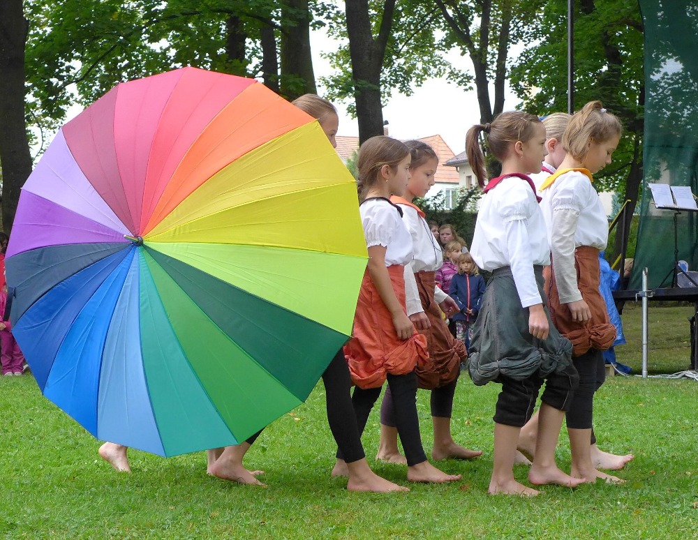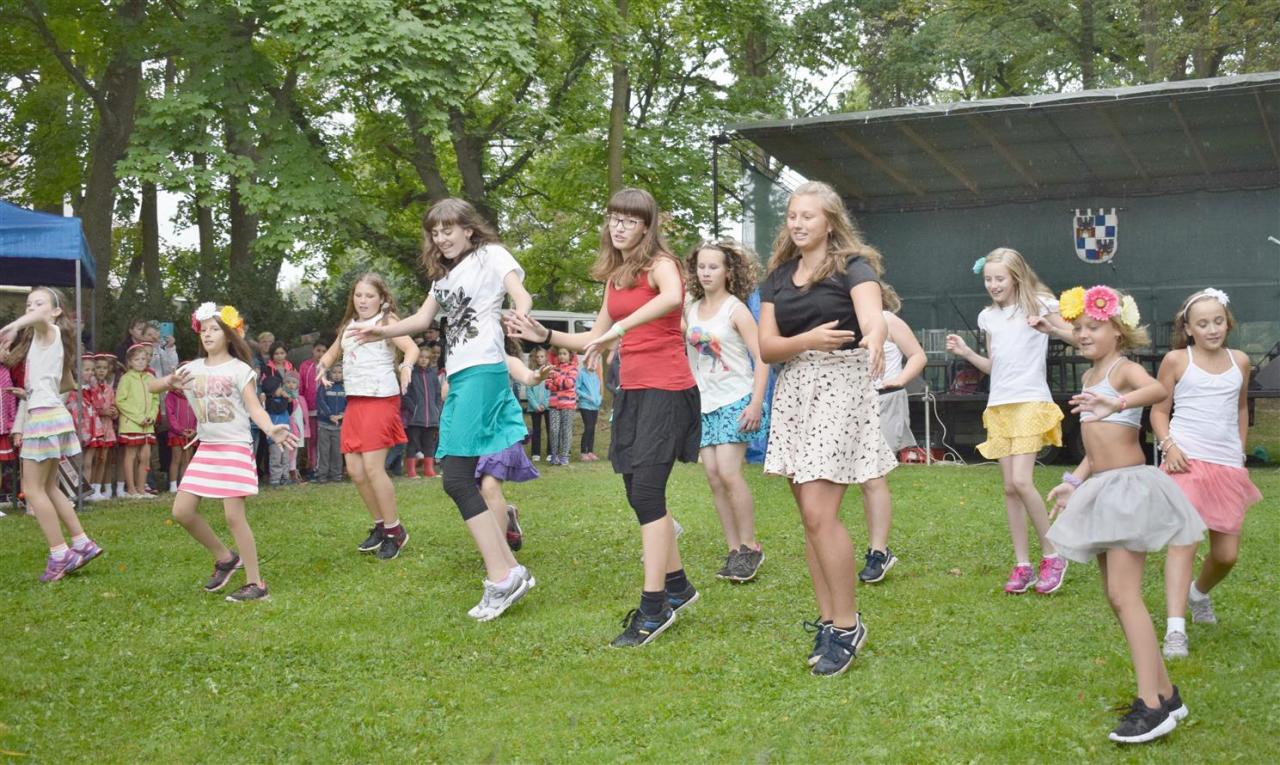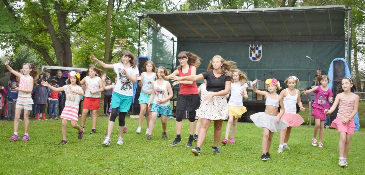 Po úvodních proslovech pódium patřilo dětem. Žáci základních škol si spolu se svými učiteli připravili téměř dvouhodinové pásmo tance, hudby, recitace a zpěvu. Jejich výkony v deštivém odpoledni sklidily zasloužené ovace. Zejména tanečnice a malé mažoretky, které v lehkých kostýmech cvičily v dešti na mokré trávě, budily soustrast a obdiv zároveň. Jejich výkony byly totiž, i přes nepřízeň počasí, stoprocentní.