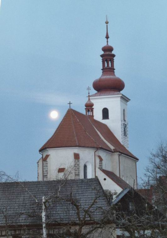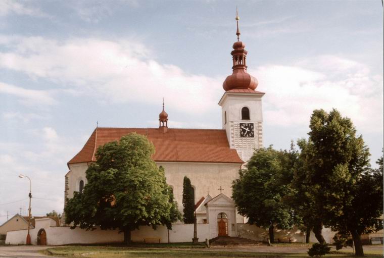 Po západní straně kostela se k nebi zdvihá štíhlá věž, která je k prvnímu výstupku románská, dostavba je pak barokní, s cibulovitou bání a renesanční výzdobou v podobě psaníčkovitých sgrafit. Věž se svými třímetrovými zdmi sloužila v bouřlivých dobách jako útočiště věřících.