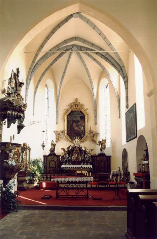 V 2. polovině 14. století (kolem roku 1375) byla románská apsida odstraněna a loď rozšířena o presbytář zakončený pěti stranami nepravidelného osmiúhelníku. Presbytář je zvenčí opřen pilíři a uvnitř opatřen vysokou klenbou na kamenných žebrech na hranách jemně žlábkovaných. Presbytář býval osvětlován čtyřmi většími a dvěma menšími okny s gotickým klenutím a kamennými kružbami. Do dnešních dnů se dochovala pouze tři okna, protože při budování sakristie bylo jedno okno zazděno. Také kamenné kružby byly později odstraněny (prý aby nebránily průniku světla dovnitř). I v lodi byla vybudována čtyři gotická okna podobná těm v presbytáři a mezi lodí a presbytáriem byl upraven vítězný oblouk. Do lodi se vchází od severní strany čtvercovou síní, v níž visel obraz "Sněm církevních otců" ze 17. století. Nyní je obraz pověšen v presbytáři.