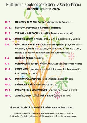 V sobotu 4. dubna 2026 se v Sedlci-Prčici koná festival zaměřený na rodiny s dětmi. Na návštěvníky čekají divadélka, skákací hrady a další atrakce, jakož i tvořivé dílničky. Můžete se těšit na úžasné motorové mazlíčky a pestrou nabídku jídel z různých koutů světa. Živá hudba od Lukase Vilimovského.